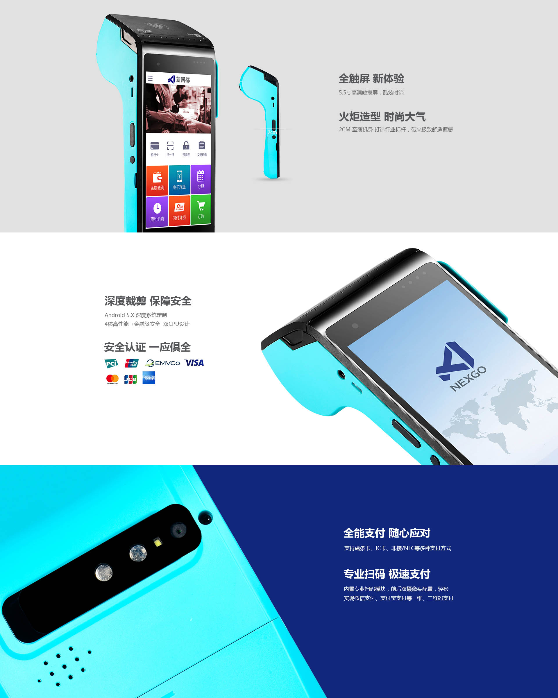 簡(jiǎn)約大方、性能卓越、大尺寸觸摸彩屏設(shè)計(jì)+智能系統(tǒng)的實(shí)用搭配,集成了傳統(tǒng)與智能手持POS的功能。